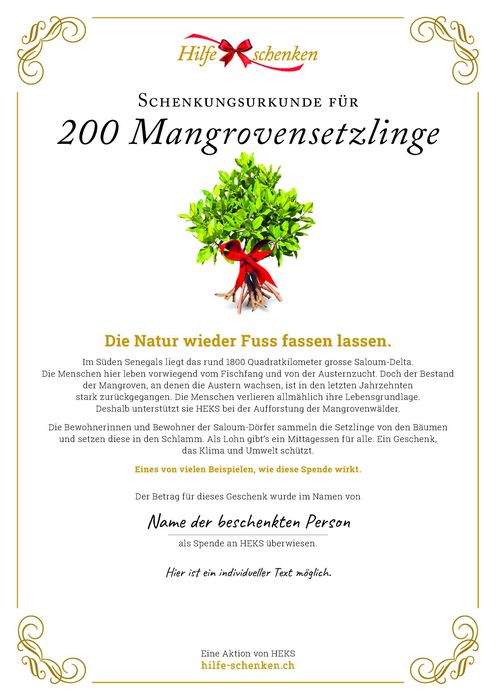 Die Bewohnerinnen und Bewohner der Saloum-Dörfer sammeln die Setzlinge von den Bäumen und setzen diese in den Schlamm. Als Lohn gibt’s ein Mittagessen für alle. Ein Geschenk, das Klima Umwelt schützt.