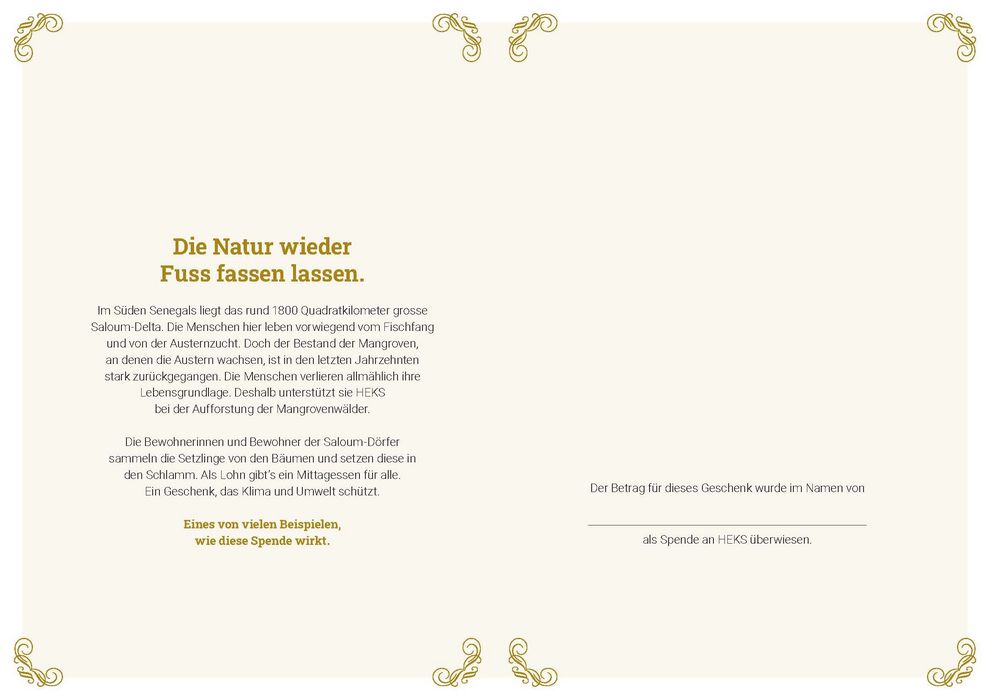 Im Süden Senegals liegt das rund 1800 Quadratkilometer grosse Saloum-Delta. Die Menschen hier leben vorwiegend vom Fischfang und von der Austernzucht. Doch der Bestand der Mangroven, an denen die Austern wachsen, ist in den letzten Jahrzehnten stark zurückgegangen. Die Menschen verlieren allmählich ihre Lebensgrundlage. Deshalb hilft ihnen HEKS bei der Aufforstung der Mangrovenwälder.