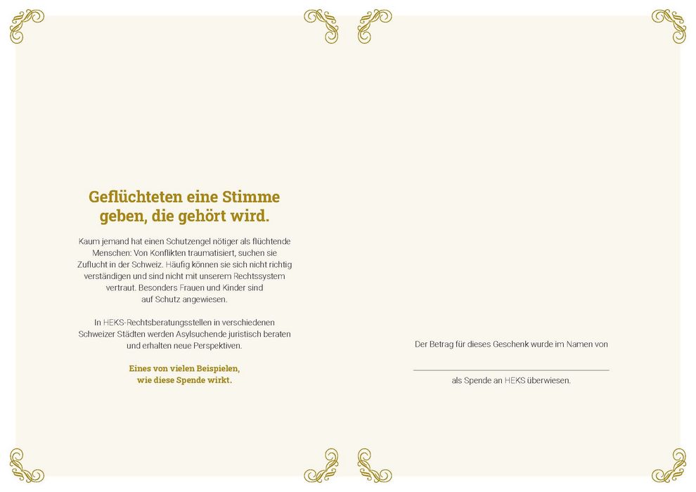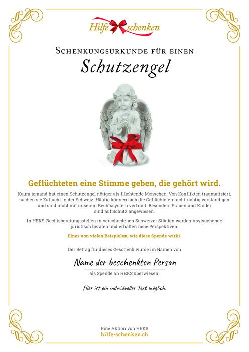 Kaum jemand hat einen Schutzengel nötiger als geflüchtete Menschen: Von Konflikten traumatisiert, suchen sie Zuflucht in der Schweiz. Häufig können sie sich nicht richtig verständigen und sind mit unserem Rechtssystem nicht vertraut. Besonders Frauen und Kinder sind auf Schutz angewiesen. In HEKS-Rechtsberatungsstellen in verschiedenen Schweizer Städten werden Asylsuchende juristisch beraten und erhalten neue Perspektiven.