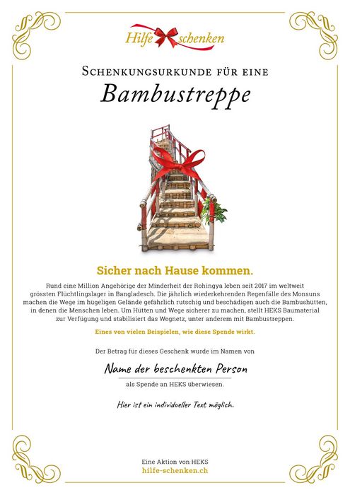 Die jährlich wiederkehrenden Regenfälle des Monsuns machen die Wege im hügeligen Gelände gefährlich rutschig und beschädigen auch die Bambushütten. Um Hütten und Wege sicherer zu machen, stellt HEKS Baumaterial zur Verfügung und stabilisiert das Wegnetz, unter anderem mit Bambustreppen.