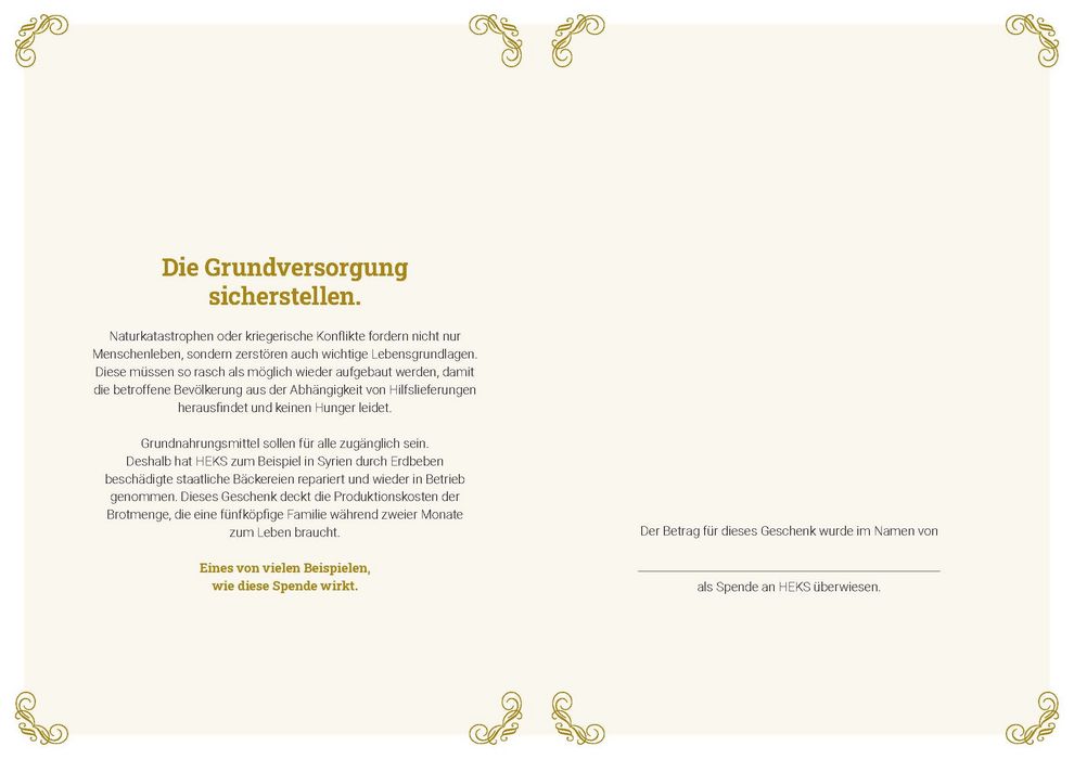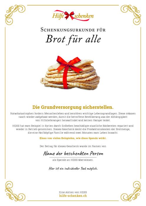 Grundnahrungsmittel sollen für alle zugänglich sein. Deshalb hat HEKS zum Beispiel in Syrien durch Erdbeben beschädigte staatliche Bäckereien repariert und wieder in Betrieb genommen. Dieses Geschenk deckt die Produktionskosten der Brotmenge, die eine fünfköpfige Familie während zweier Monate zum Leben braucht.
