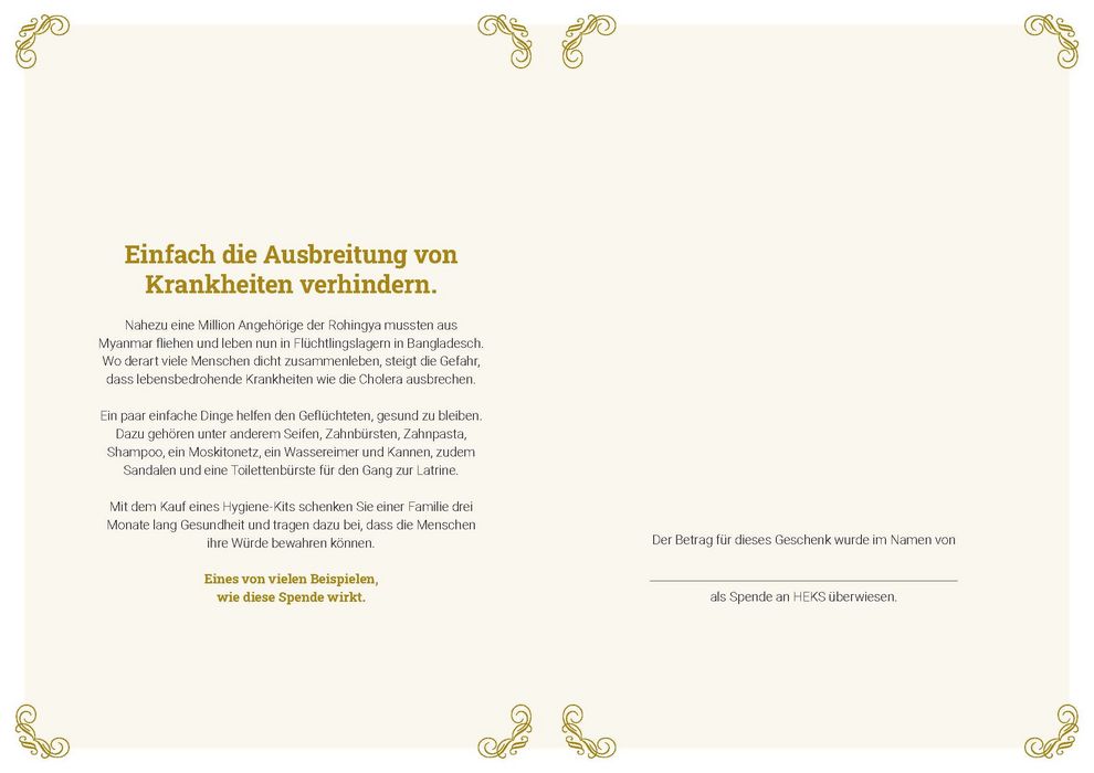 Ein paar einfache Dinge helfen den Geflüchteten, gesund zu bleiben. Dazu gehören unter anderem Seifen, Zahnbürsten, Zahnpasta, Shampoo, ein Moskitonetz, ein Wassereimer und Kannen, zudem Sandalen und eine Toilettenbürste für den Gang zur Latrine.