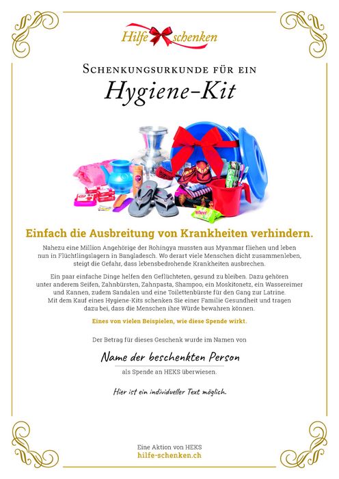Mit dem Kauf eines Hygiene-Kits schenken Sie einer Familie drei Monate lang Gesundheit und tragen dazu bei, dass die Menschen ihre Würde bewahren können.