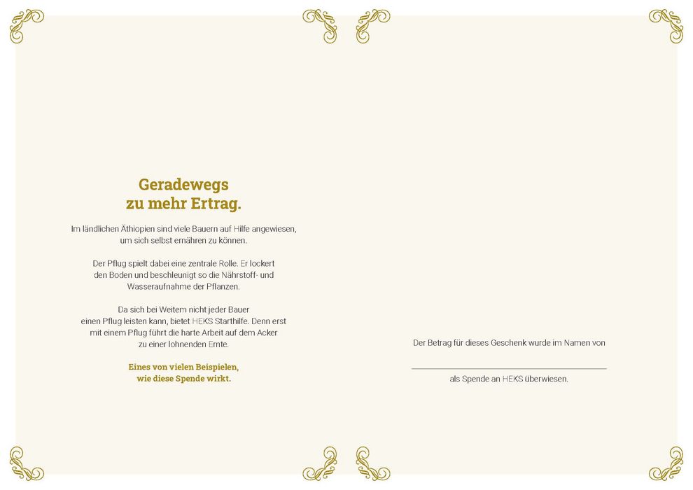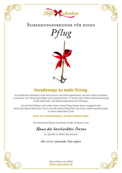 Im ländlichen Äthiopien sind viele Bauern auf Hilfe angewiesen, um ihre Familien ernähren zu können. Der Pflug spielt dabei eine zentrale Rolle. Er lockert den Boden und beschleunigt so die Nährstoff- und Wasseraufnahme der Pflanzen. Da sich bei Weitem nicht jeder Bauer einen Pflug leisten kann, engagiert sich HEKS mit dieser Starthilfe. Denn erst mit einem Pflug führt die harte Arbeit auf dem Acker zu einer lohnenden Ernte.