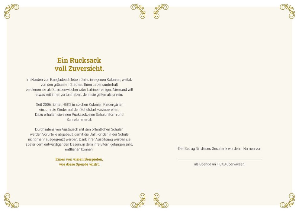 Damit sich die Kinder auf den für sie schwierigen Schulstart vorbereiten können, richtet HEKS in Dalit-Kolonien Kindergärten ein. Die Kinder erhalten einen Rucksack, eine Schuluniform und Schreibmaterial. Durch intensiven Austausch mit den öffentlichen Schulen sollen Vorurteile abgebaut werden. Dank ihrer Ausbildung werden die Kinder später dem entwürdigenden Dasein, in dem ihre Eltern gefangen sind, entfliehen können.