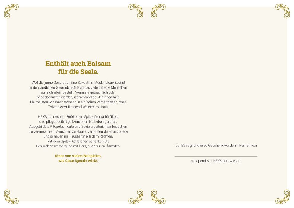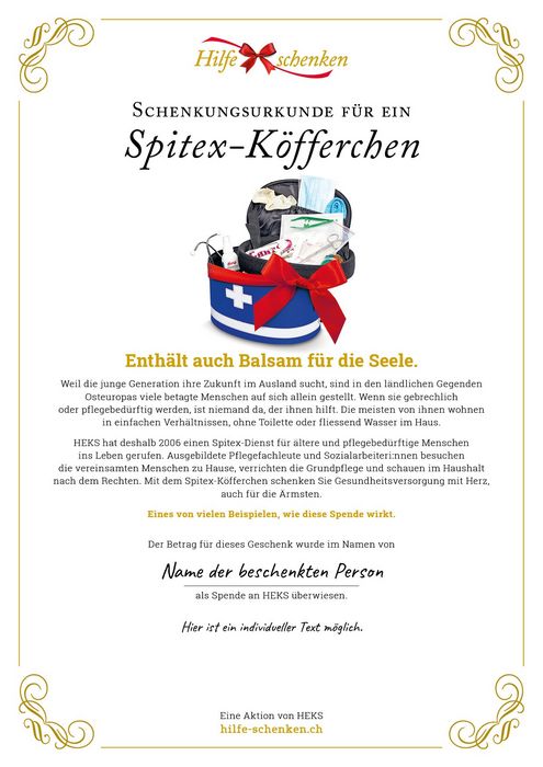 HEKS hat deshalb 2006 einen Spitex-Dienst für ältere und pflegebedürftige Menschen ins Leben gerufen. Ausgebildete Pflegefachleute und Sozialarbeiter:innen besuchen die vereinsamten Menschen zu Hause, verrichten die Grundpflege und schauen im Haushalt nach dem Rechten. Mit dem Spitex-Köfferchen schenken Sie Gesundheitsversorgung mit Herz, auch für die Ärmsten.